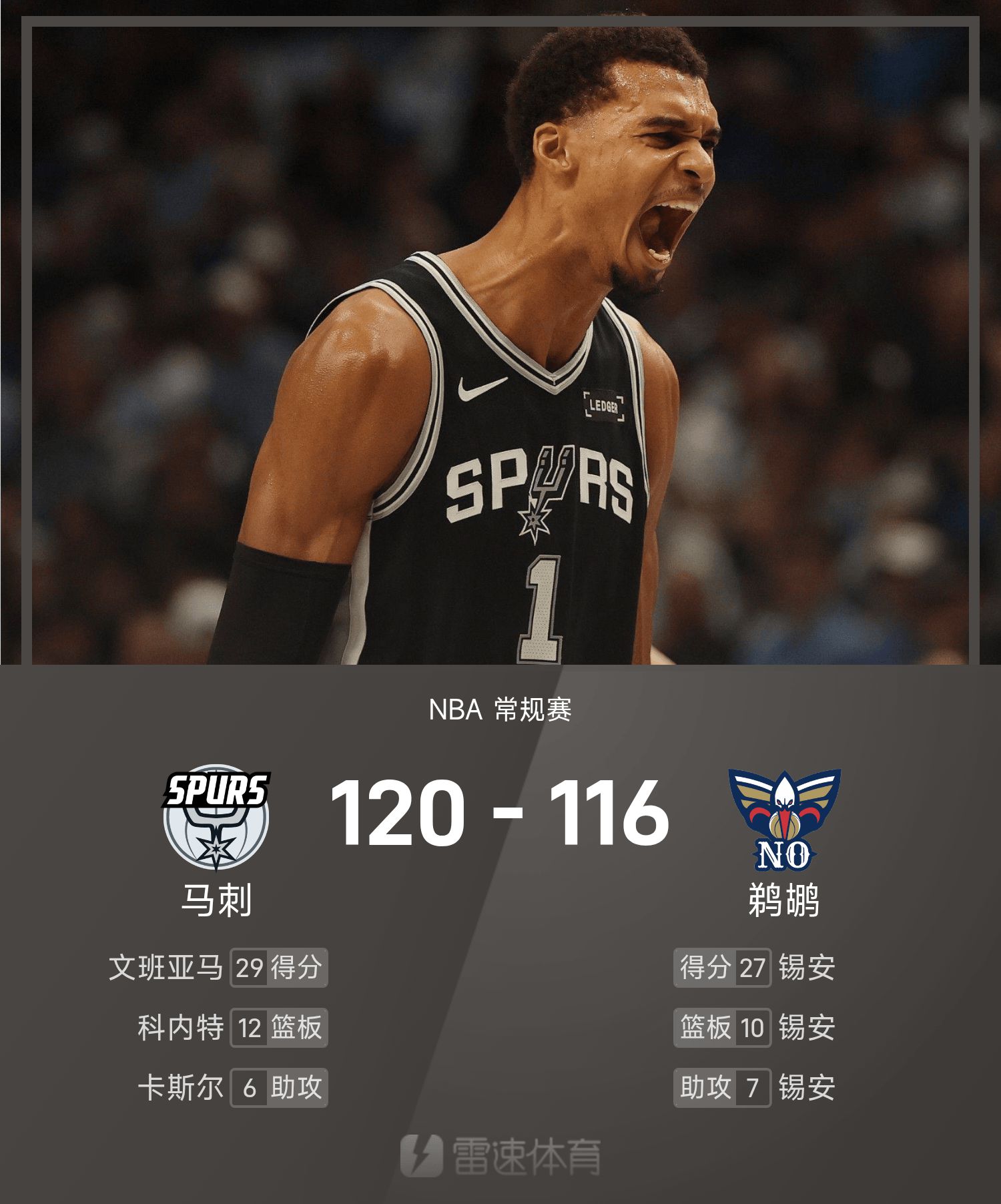 รายงานเกม NBA บุนยามะมี 29 แต้ม 9 บล็อก สเปอร์ส เฉือนเอาชนะ เพลิแกนส์ 120-116 ในช่วงต่อเวลาพิเศษ