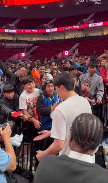 โซเชียลมีเดียอย่างเป็นทางการของ NBA โพสต์วิดีโอ แสดงให้เห็นแฟนๆ จำนวนมากกำลังรอ Yang Hansen ในอุโมงค์ก่อนเริ่มเกม