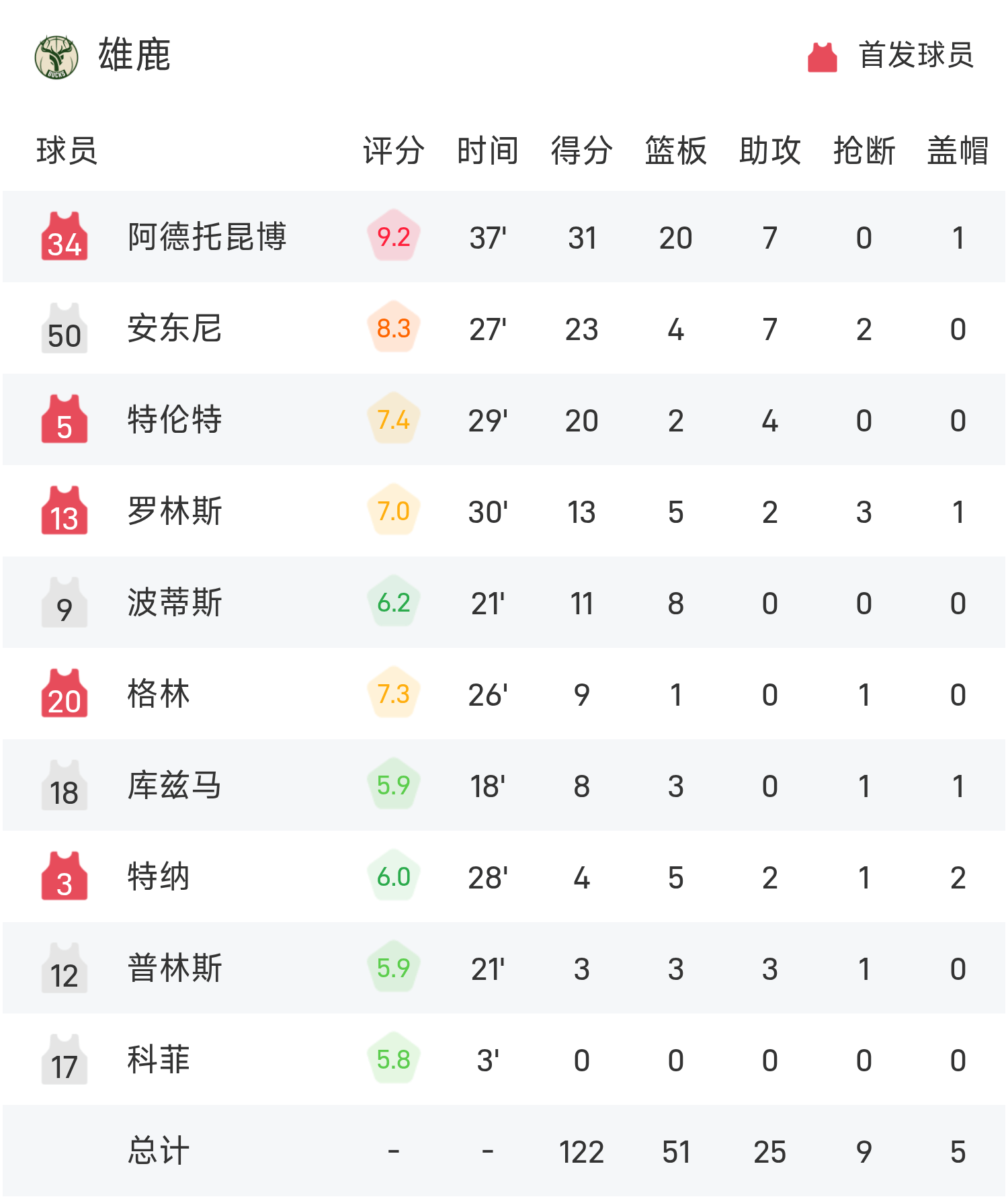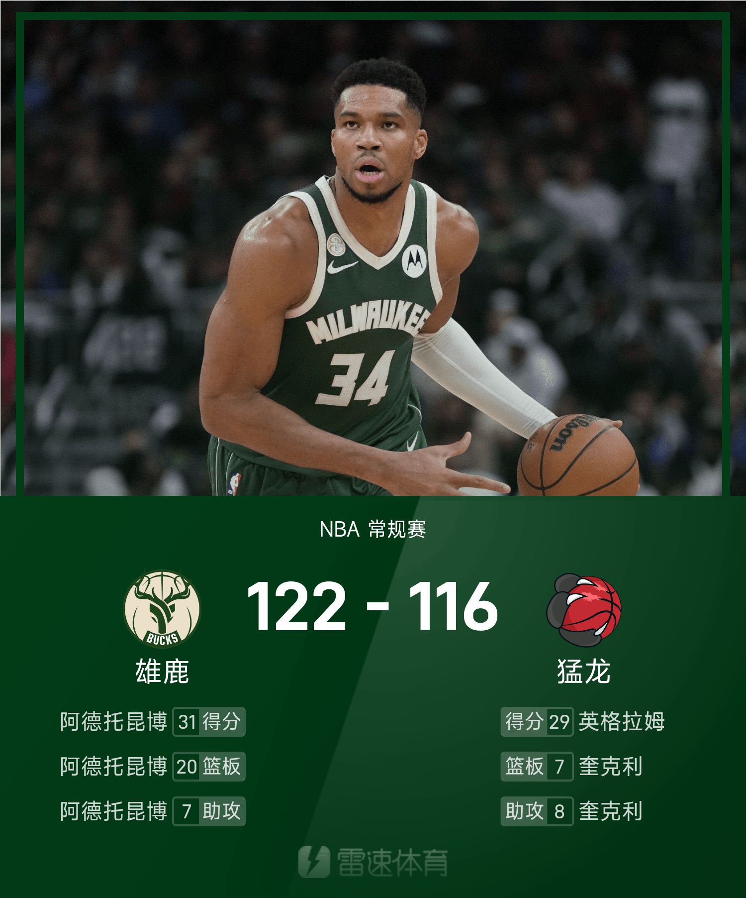 รายงาน NBA: อันเทโทคูมโป 31 แต้ม 20 รีบาวด์ 7 แอสซิสต์ บัคส์ เอาชนะ แร็พเตอร์ส 122-116
