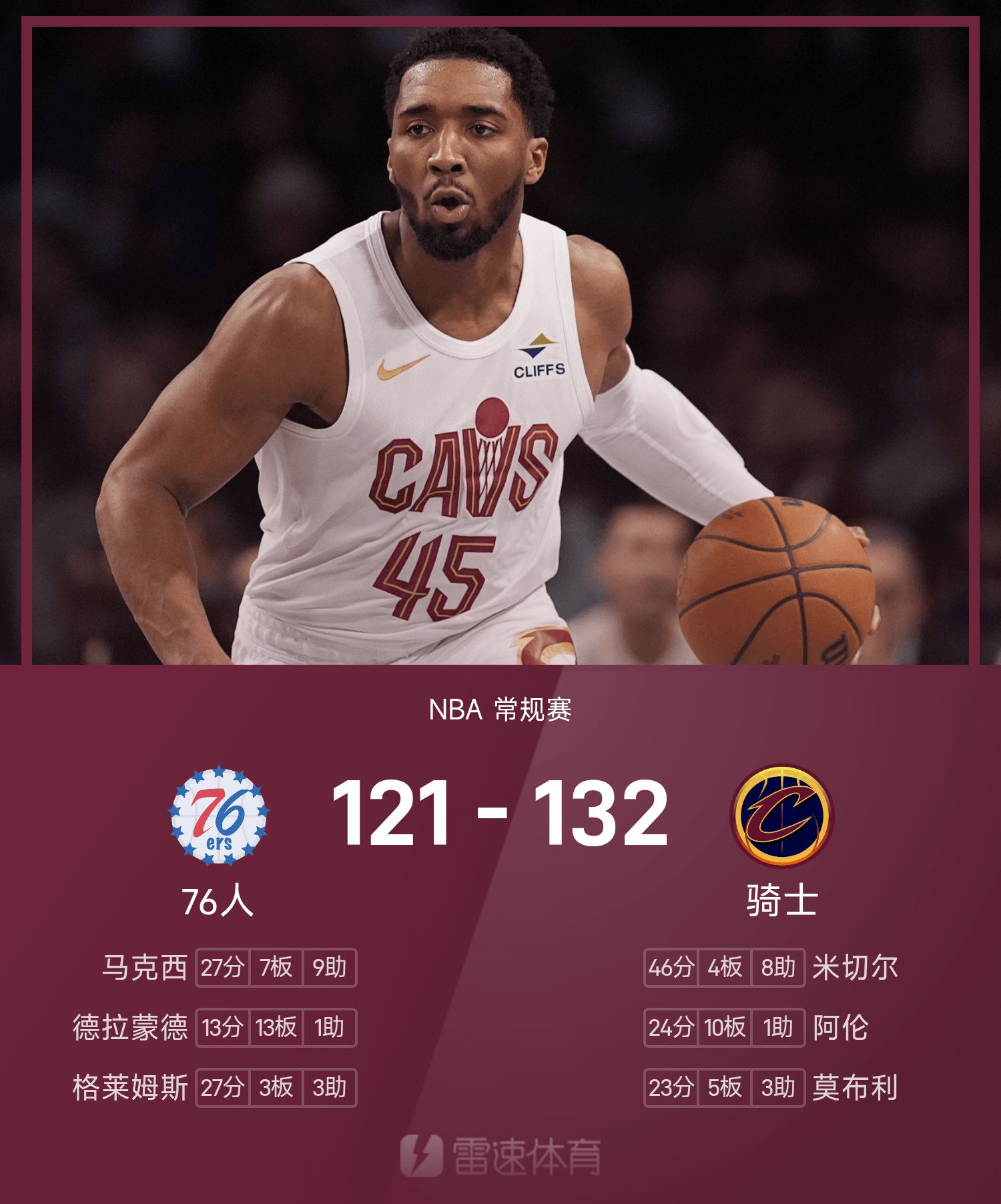 รายงานเกม NBA มิทเชล 46 แต้ม 8 แอสซิสต์ คาวาเลียร์ส เอาชนะ 76ers 132-121