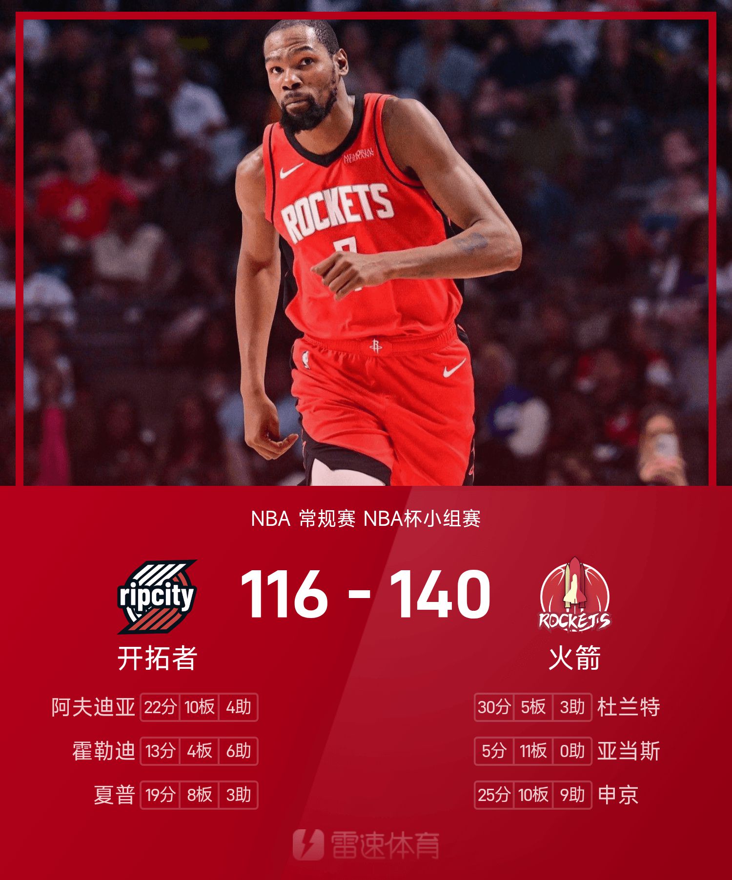 รายงาน NBA Cup: ดูแรนท์ทำ 30 แต้ม ร็อคเก็ตส์เอาชนะเทรลเบลเซอร์ส 140-116
