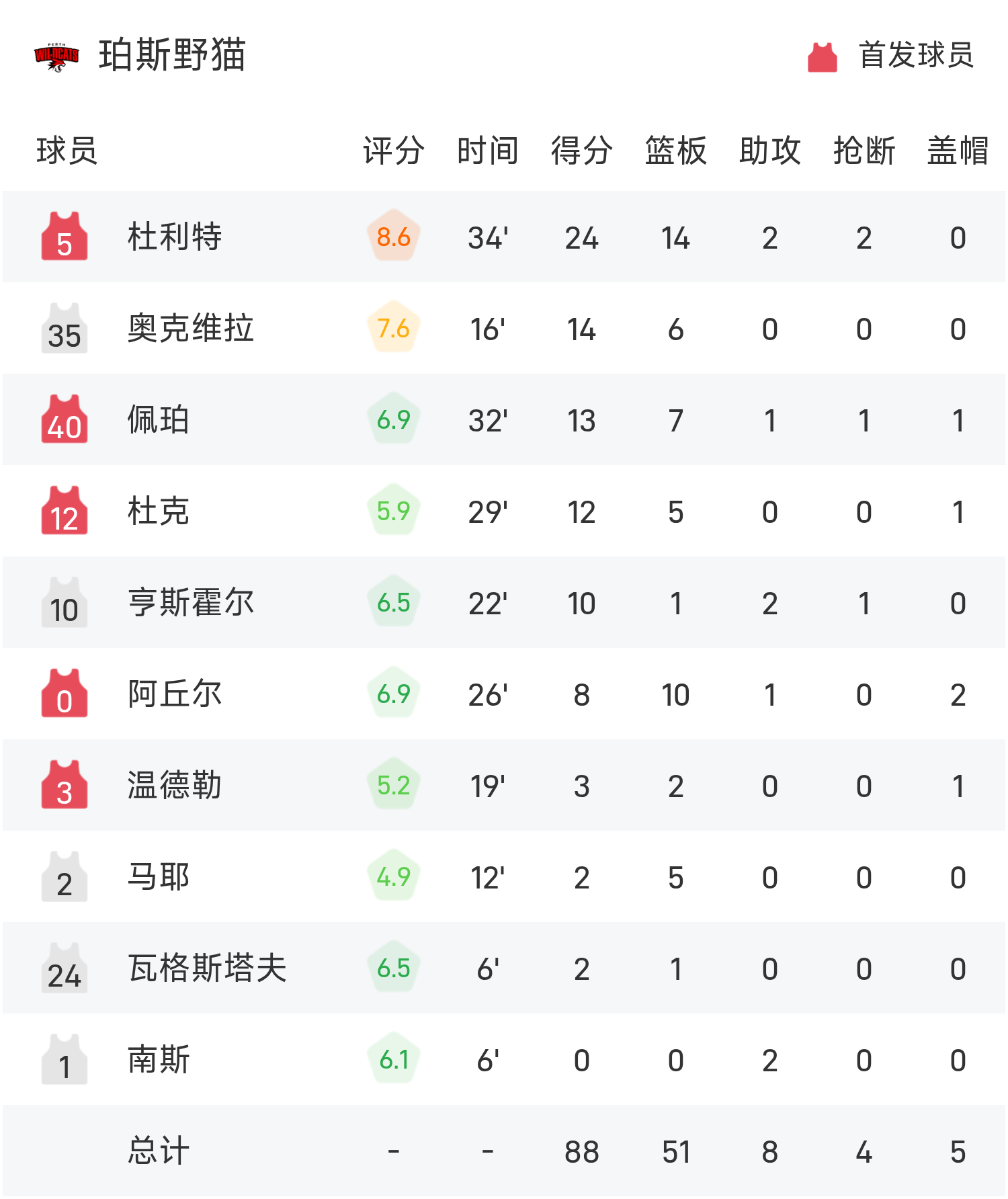 6686 กีฬา ข่าว 15 พฤศจิกายน ในฤดูกาลปกติ 25/26 NBL ทีม Perth Wildcats เผชิญหน้ากับเรือพิฆาตนิวซีแลนด์ จบเกม Perth Wildcats เอาชนะ New Zealand Destroyers 88-75 ดูลิตเติ้ลทำคะแนนสูงสุดในเกม 24 แต้ม 14 รีบาวน์และ 2 แอสซิสต์ นำทีมเพิร์ธไวลด์แคทส์คว้าชัยชนะ