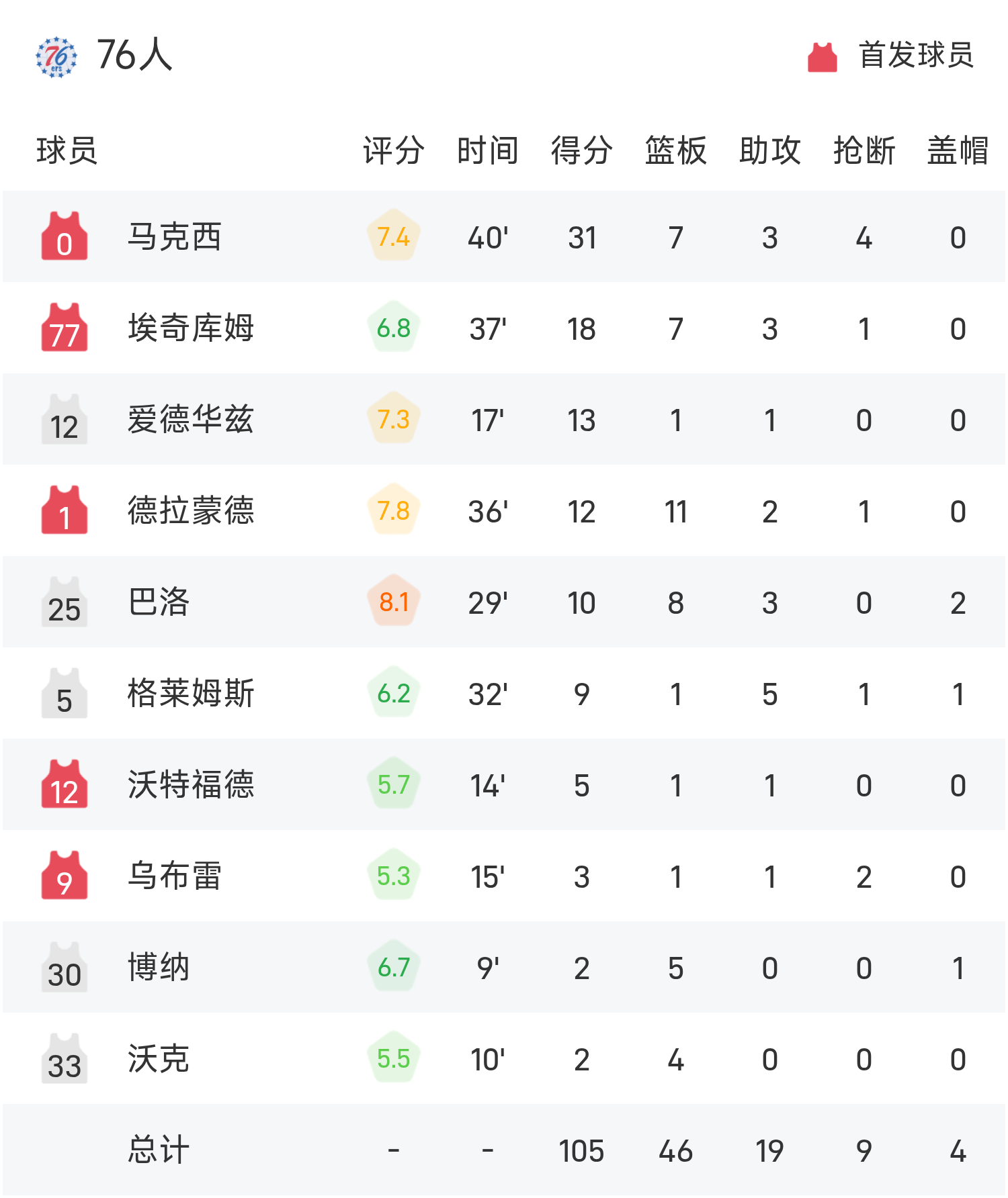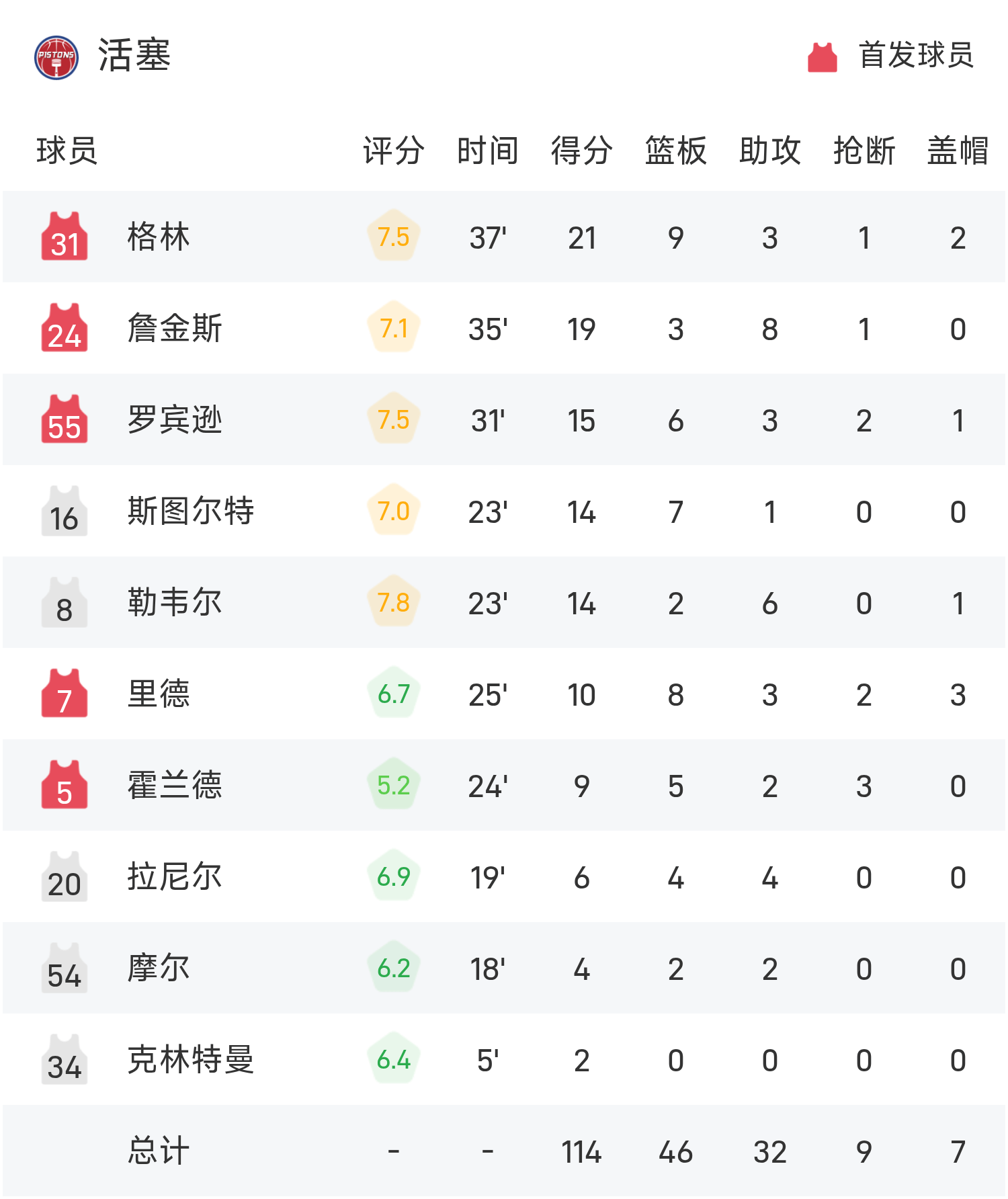 6686 กีฬา ข่าว 15 พฤศจิกายน ในการแข่งขันรอบแบ่งกลุ่ม NBA Cup ประจำฤดูกาล 25/26 ของ NBA Pistons เผชิญหน้ากับ 76ers จบเกม พิสตันส์ เอาชนะ เซเวนตีซิกเซอร์ส 114-105 กรีนทำ 21 แต้ม 9 รีบาวด์ 3 แอสซิสต์ พาทีมคว้าชัย แม็กซี่ทำคะแนนสูงสุดในเกม 31 แต้ม 7 รีบาวด์ 3 แอสซิสต์