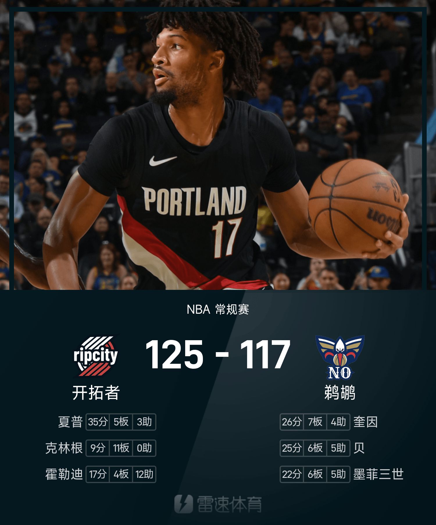 6686 กีฬา ข่าว 13 พฤศจิกายน ในฤดูกาลปกติ 25/26 ของ NBA ทีม Pelicans เผชิญหน้ากับ Trail Blazers จบเกม เพลิแกนส์ แพ้ เทรลเบลเซอร์ส 117-125 ชาร์ปทำคะแนนสูงสุดในเกม 35 แต้ม 5 รีบาวน์และ 3 แอสซิสต์ นำทีมเทรลเบลเซอร์คว้าชัยชนะ