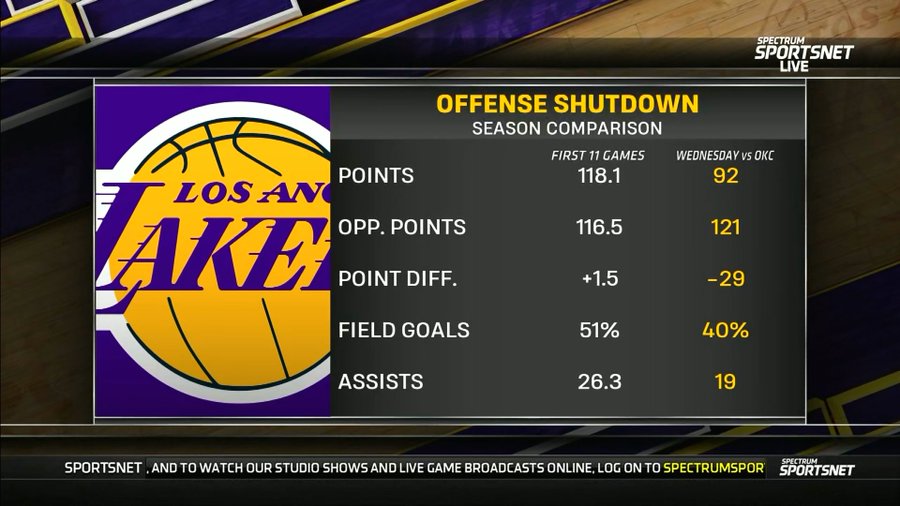 หลังจบเกม สถานีโทรทัศน์ของอเมริกาเปรียบเทียบข้อมูลของ Lakers สำหรับเกมนี้กับข้อมูลสำหรับ 11 เกมแรกของฤดูกาล ข้อมูลทั้งหมดตกลงไปทั่วกระดาน