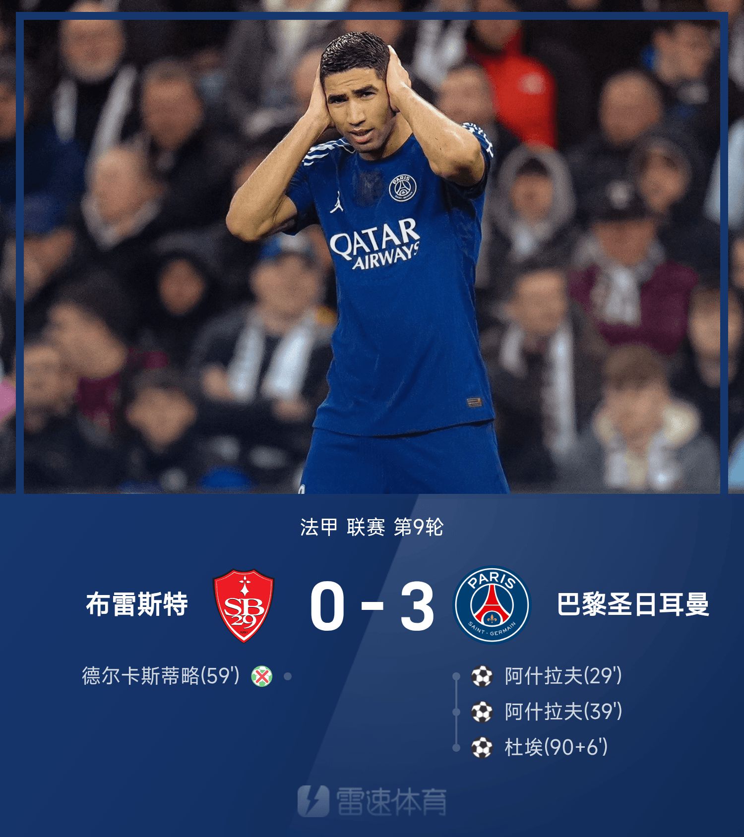 รายงานการต่อสู้ลีกเอิง: อชราฟยิงสองนัด, เดล กัสติลโลพลาดแต้ม, ปารีส 3-0 เบรสต์