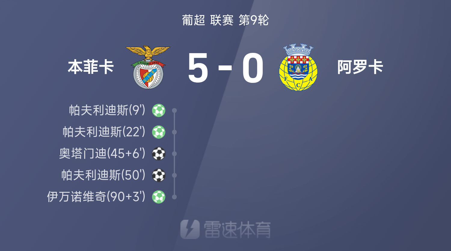 6686 กีฬา 26 ตุลาคม ในรอบที่ 9 ของซูเปอร์ลีกโปรตุเกส 25/26 เบนฟิก้าเอาชนะอโรคา 5-0 ตลอดทั้งเกม ปาฟลิดิสทำแฮตทริกด้วยความช่วยเหลือจากพระเจ้า ขณะที่อิวาโนวิชและโอตาเมนดี้ทำประตูได้
