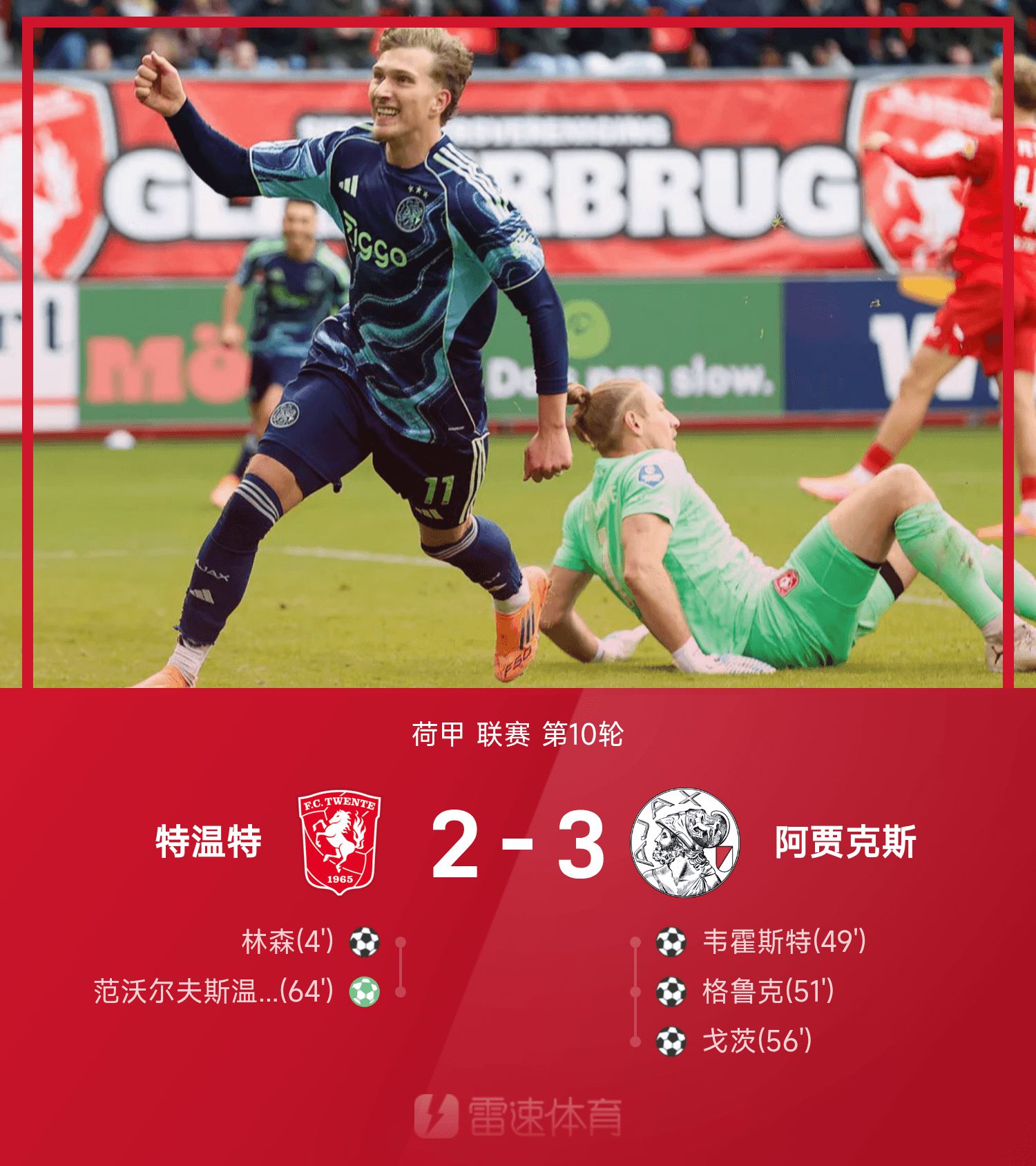 6686 Sports 26 ตุลาคม ในรอบที่ 10 ของฤดูกาล 25/26 เอเรดิวิซี่ อาแจ็กซ์เอาชนะทเวนเต้ 3-2 ตลอดทั้งเกม ลินซ์เริ่มเกมแบบสายฟ้าแลบ ในครึ่งหลัง Wehorst, Gluck และ Goetz ยิงได้ 3 ประตูใน 7 นาทีเพื่อพลิกกลับให้เสร็จสิ้น ฟาน โวล์ฟสวิงเคิล ยิงจากระยะ 12 หลาเซฟเกม