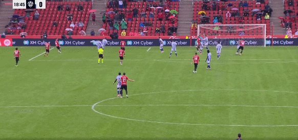 44' โมราเนสระดมวอลเลย์อันทรงพลังจากโซนสามวินาทีและถูกผู้รักษาประตูสกัดไว้