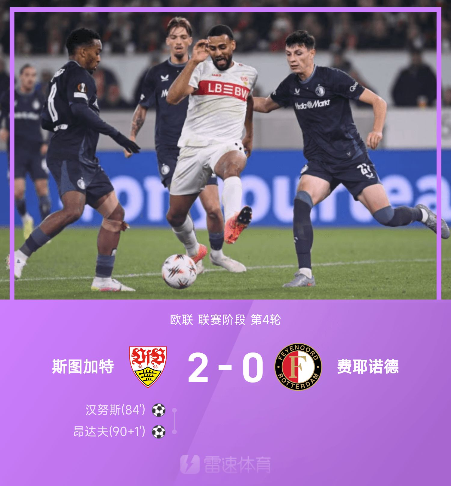 6686 ข่าวกีฬาเมื่อวันที่ 7 พฤศจิกายน ในรอบที่สี่ของยูโรปาลีก 25-26 สตุ๊ตการ์ทเล่นในบ้านกับเฟเยนูร์ด ในครึ่งแรกของฤดูกาลนี้ ทั้งสองฝ่ายต่างทำประตูไม่ได้ เปลี่ยนข้างมาสู้กันใหม่ ฮันนัส ก้าวมาหน้าประตูเพื่อรับบอลจาก อัสเกรัน จากทางขวาเข้าเขตโทษแล้วทำประตูได้ ออนดาฟู ยิงประตูว่างและยิงอีกประตูในช่วงทดเวลาบาดเจ็บ จบเกม สตุ๊ตการ์ท 2-0 เฟเยนูร์ด