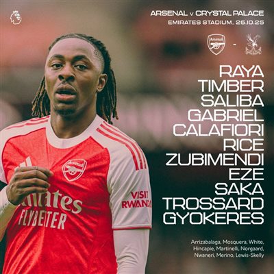 6686 Sports รายงานเมื่อวันที่ 26 ตุลาคมว่าในรอบที่ 9 ของพรีเมียร์ลีก เจ้าบ้านอาร์เซนอล พบคริสตัล พาเลซ ก่อนเกม จะมีการประกาศรายชื่อตัวจริงของทั้งสองทีม