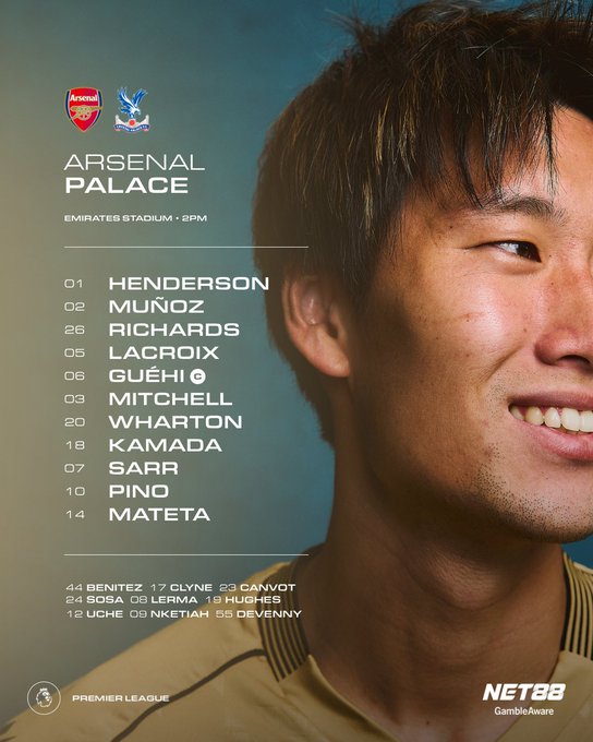 คริสตัล พาเลซ รายชื่อตัวจริง: 1-ดีน เฮนเดอร์สัน, 2-มูโนซ, 3-มิทเชล, 6-กีย์, 5-ลาครัวซ์, 26-ริชาร์ดส, 18-คามาดะ ไดอิชิ, 20-วอร์ตัน, 7-ซาร์, 10-ปิโน่, 14-มัตเตต้า