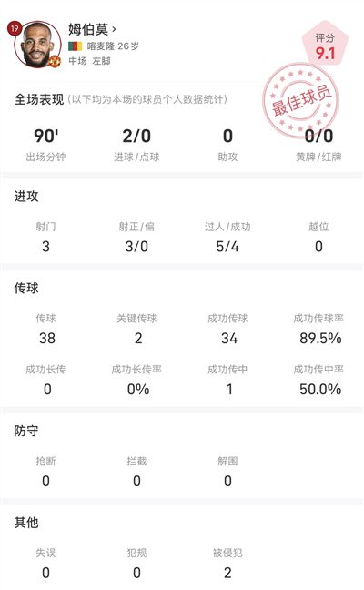 6686 ข่าวกีฬาวันที่ 26 ตุลาคม ในเกมโฟกัสแมตช์รอบที่ 9 ของพรีเมียร์ลีกที่เพิ่งจบลง แมนเชสเตอร์ ยูไนเต็ด เอาชนะไบรท์ตัน 4-2 ในบ้าน เอ็มบิวโม กองหน้าแมนเชสเตอร์ ยูไนเต็ด ทำประตูได้ 2 ประตูในเกมนี้ และในช่วงสุดท้ายของเกม ไบรท์ตัน ก็ได้ทำประตูเมื่อสกอร์เป็น 2-3 ช่วยให้ทีมรักษาเสถียรภาพของสถานการณ์และผนึกชัยชนะได้