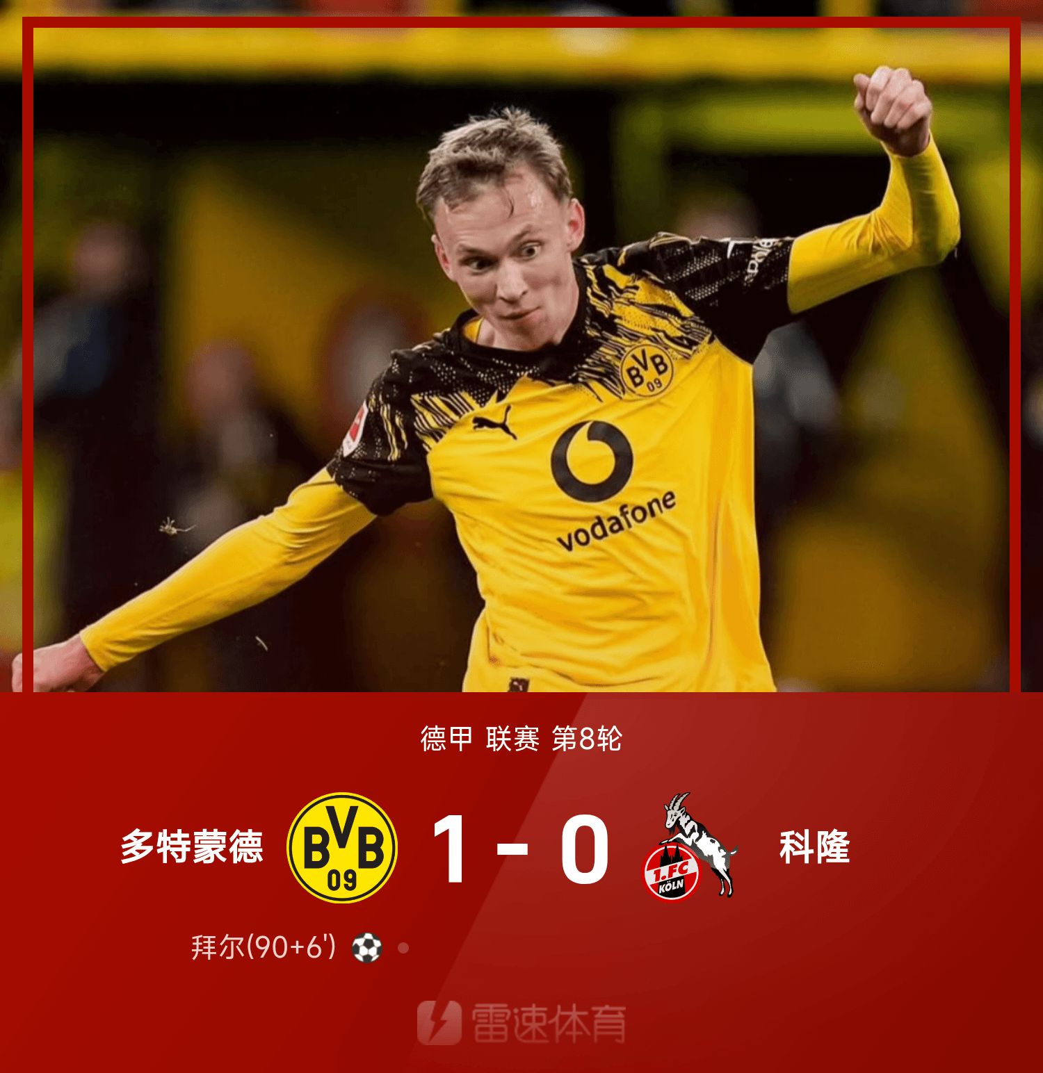 รายงานผลการแข่งขันบุนเดสลีกา สเวเบอร์เซฟได้เยี่ยมซ้ำๆ, ไบเออร์ยิงประตูสุดท้ายในช่วงทดเวลาบาดเจ็บ, ดอร์ทมุนด์ 1-0 โคโลญจน์