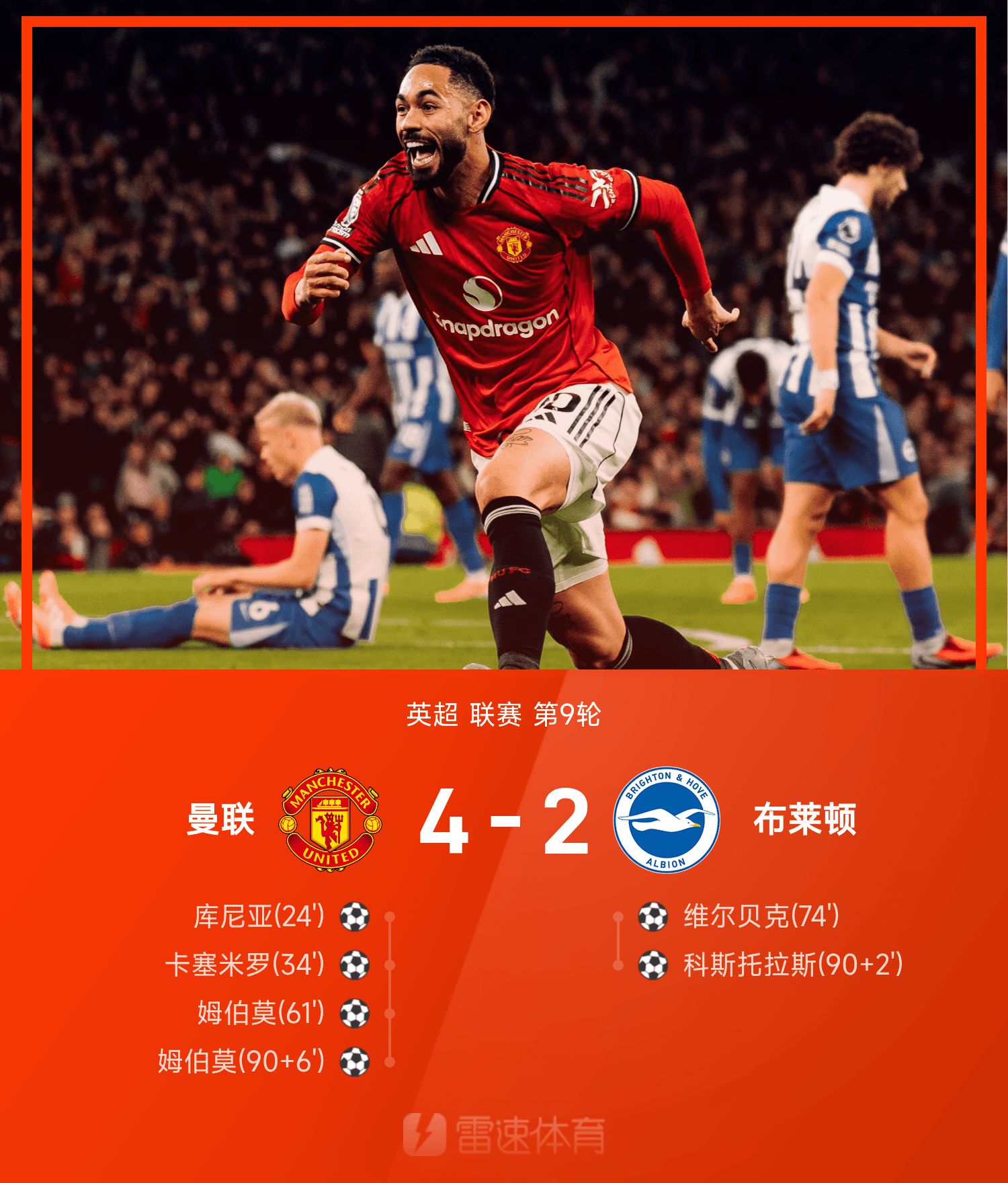 6686 กีฬา 26 ตุลาคม ในรอบที่เก้าของฤดูกาล 25/26 พรีเมียร์ลีก แมนเชสเตอร์ยูไนเต็ดเผชิญหน้ากับไบรท์ตันในบ้าน ทั้งสองทีมแลกกันรุกและป้องกันในช่วงเปิดเกม และการหยุดชะงักก็พังลงในนาทีนั้น คาเซมิโรยิงประตูและกุนยายิงประตูแรกนับตั้งแต่เข้าร่วมแมนเชสเตอร์ยูไนเต็ดด้วยการยิงจากนอกเขตสามวินาที นาทีที่ 10 กองหลังกาเซมิโร่ได้ยิงประตูจากนอกตาข่าย ทำให้แมนเชสเตอร์ ยูไนเต็ด เข้าสู่ช่วงพักครึ่งแรกโดยขึ้นนำ 2-0