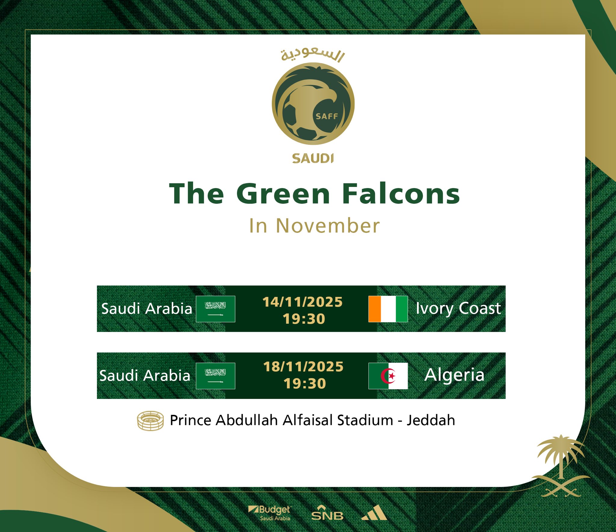 6686 Sports รายงานเมื่อวันที่ 7 พฤศจิกายนว่าทีมชาติซาอุดิอาระเบียประกาศรายชื่อสำหรับวันแข่งขันเดือนพฤศจิกายน ซาอุดีอาระเบียจะลงเล่นนัดกระชับมิตร 2 นัดกับไอวอรีโคสต์และแอลจีเรียที่สนามเหย้าในเมืองเจดดาห์