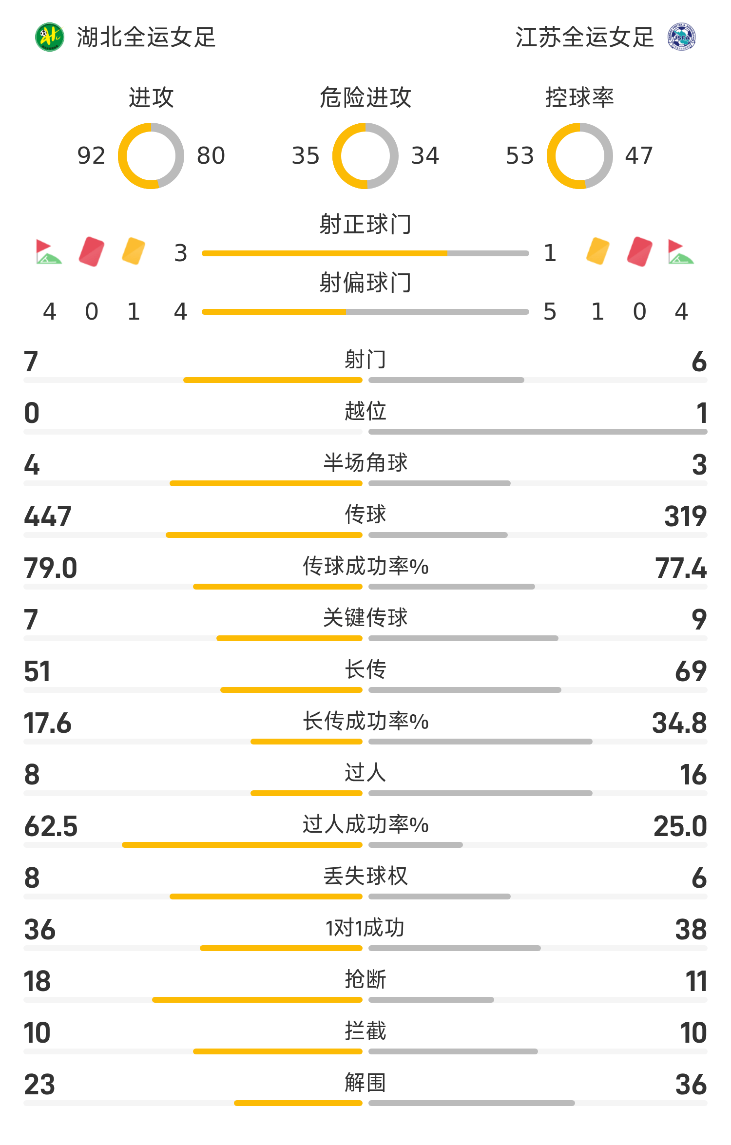 รายชื่อผู้เล่นตัวจริงของฟุตบอลหญิง Hubei National Games: 22-Chen Chen, 5-Wu Haiyan, 15-Liu Yanqiu, 13-Xu Qianqian, 37-Song Duan (68'28-Song Fei), 10-Yao Wei, 19-Yan Qi, 18-Luo Luo (60'21-Dai Chen Ying), 7-Wang Shuang, 9-Lv Yueyun (60'26-Jiang Chenjing), 27-Deng Mengye (82'8-Li Tingting)