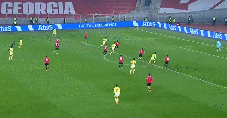 ในนาทีที่ 7 ของเกม ตอร์เรสบุกเข้าไปในโซนสามวินาทีเพื่อส่งบอลเข้าจุดโทษ พื้นที่ทำให้โกโฮลิชวิลีแฮนด์บอล สเปนเลยได้โอกาส 12 หลา จากนั้นโอวาซาบัลก็ยิงจุดโทษ 12 หลาและทำประตูแรก นาทีที่ 34 ตอร์เรสก้าวไปข้างหน้าเพื่อรับบอลจากโอยาร์ซาบัลและเตะมุมไกลช่วยให้สเปนขึ้นนำเป็น 3-0