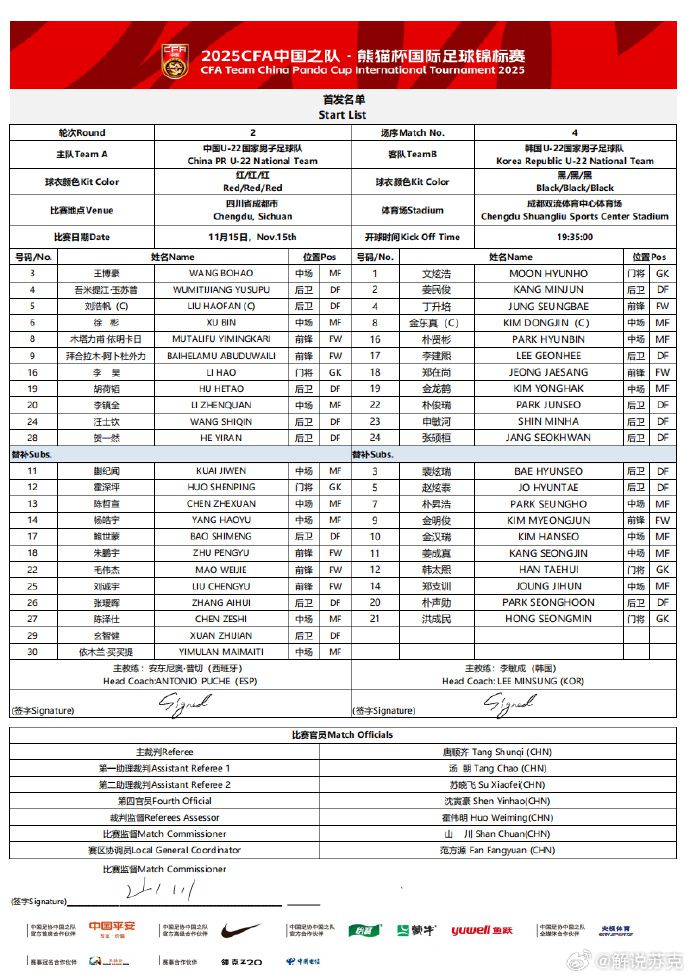 ฟุตบอลทีมชาติ U22 พบ เกาหลีใต้ รายชื่อตัวจริง: ไป๋เหอ ลามู และ หู เหอเทา ลงเล่น, หลิว เฉิงหยู่ และ คุย จีเหวิน เป็นผู้เล่นสำรอง