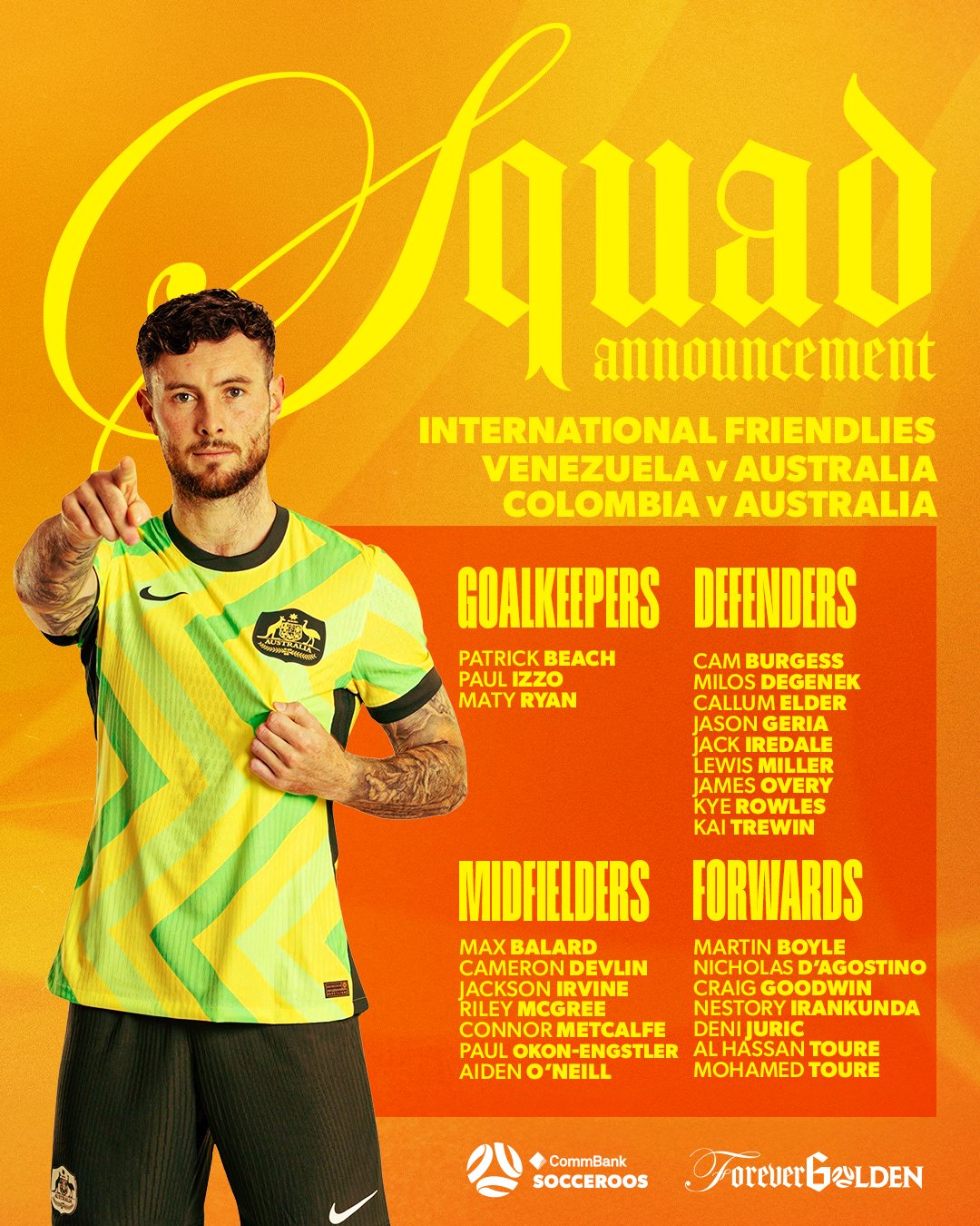 6686 Sports รายงานเมื่อวันที่ 7 พฤศจิกายนว่าทีมชาติออสเตรเลียประกาศรายชื่อใหม่ ทีมจะพบกับเวเนซุเอลาและโคลอมเบียในเดือนพฤศจิกายน รายชื่อดังกล่าวประกอบด้วย Goodwin, Boyle, Irving และผู้เล่นที่มีชื่อเสียงอื่นๆ